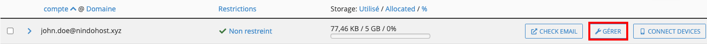 - Derrière l’adresse email concerné, cliquez sur GÉRER.