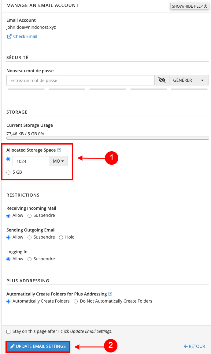 - Changez le quota puis cliquez sur le bouton UPDATE EMAIL SETTINGS.
